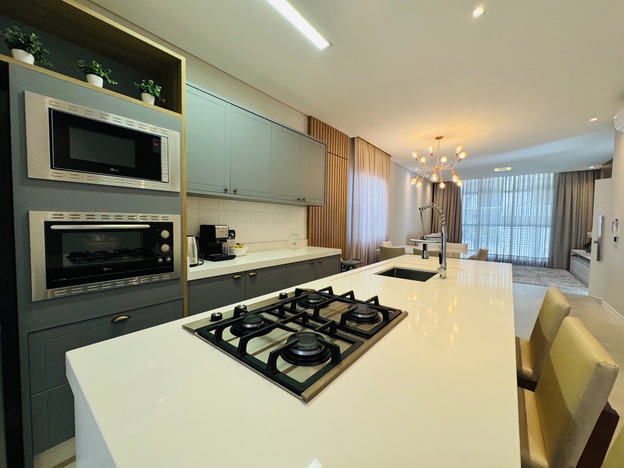 Na cozinha, os armários planejados proporcionam amplo espaço de armazenamento, permitindo que você mantenha todos os utensílios e mantimentos organizados e acessíveis. A bancada espaçosa oferece o local perfeito para preparar refeições deliciosas, enquanto os armários superiores garantem que todos os seus itens estejam ao seu alcance.