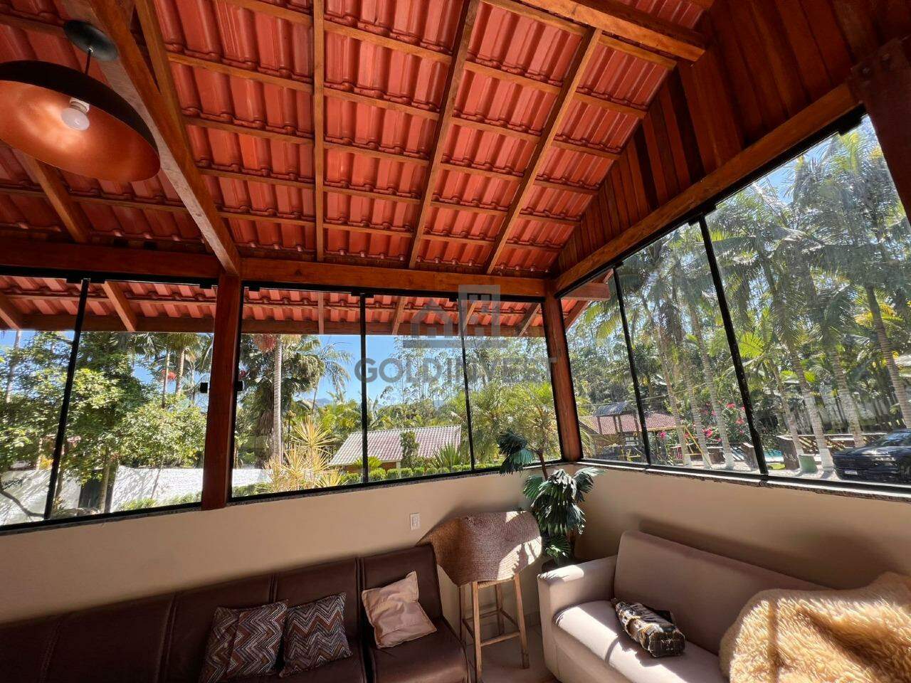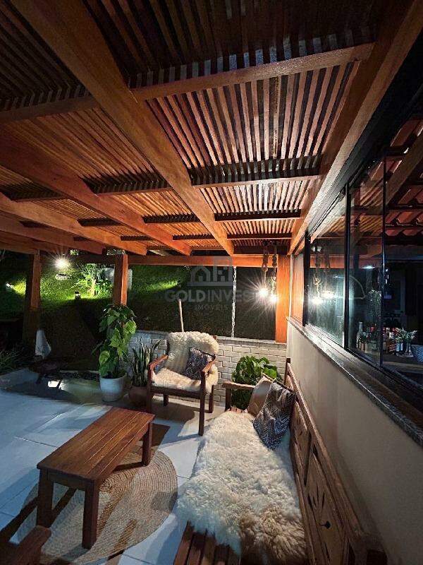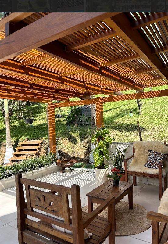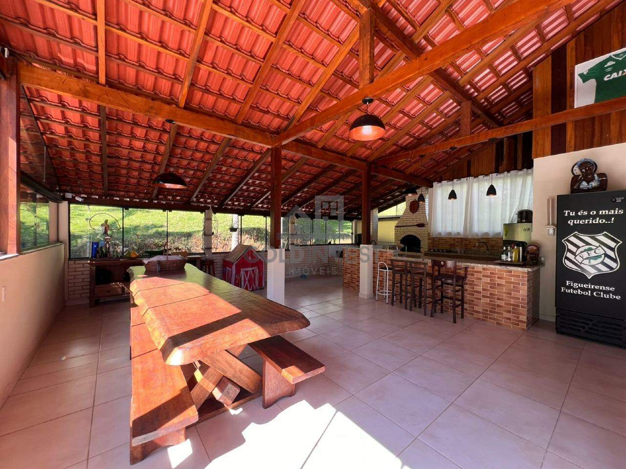 • Área de Festa 1: totalmente envidraçada, equipada com churrasqueira, fogão a lenha, forno para pizza, quarto para hóspedes, banheiro e um pergolado com sofás para descanso.