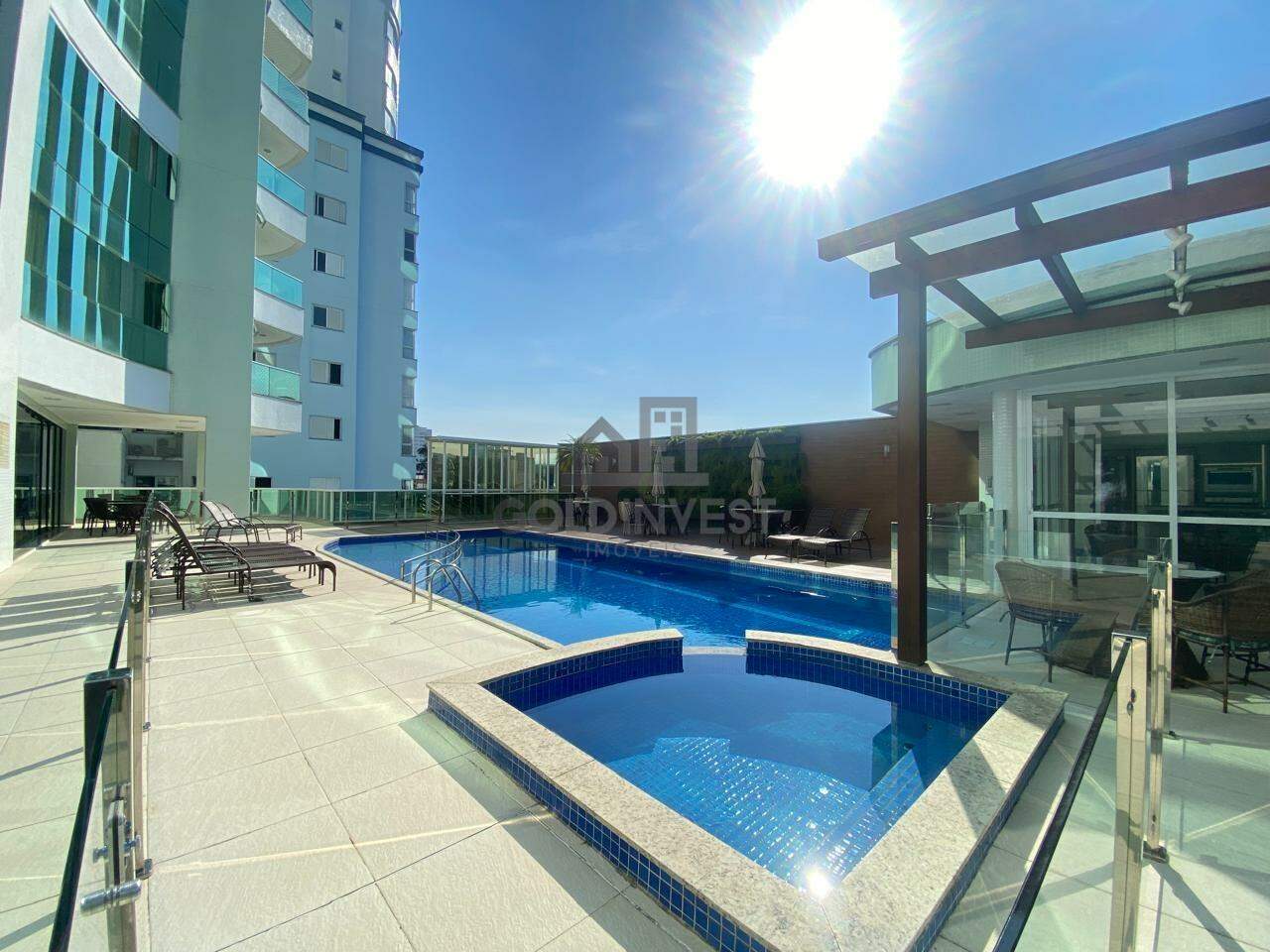 Área completa de lazer no prédio com hall de entrada decorado, piscina, playground, academia, cinema, salão de festas e área gourmet.